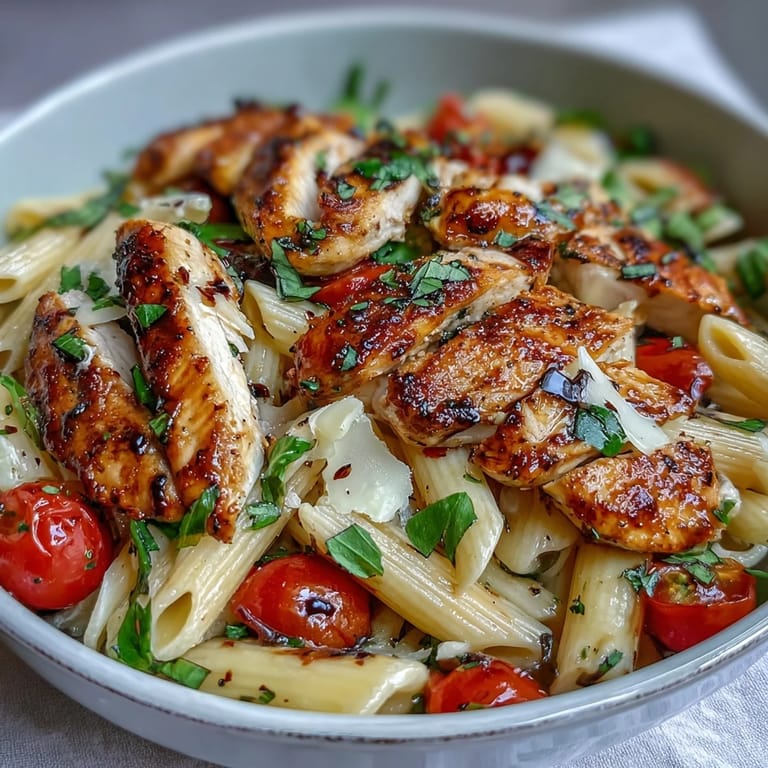 Save The first time I made this bruschetta chicken pasta, my kitchen smelled like an Italian grandmother's garden in July. Cherry tomatoes were bubbling away in the skillet, their juices mingling with garlic and shallots while the chicken developed that perfect golden crust. I'd been attempting to recreate a dish from a tiny restaurant in Chicago, but somewhere between adding too much balsamic and accidentally using all my basil in one go, this recipe evolved into something entirely its own. My roommate wandered in, drawn by the aroma, and we ended up eating straight from the skillet while leaning against the counter.