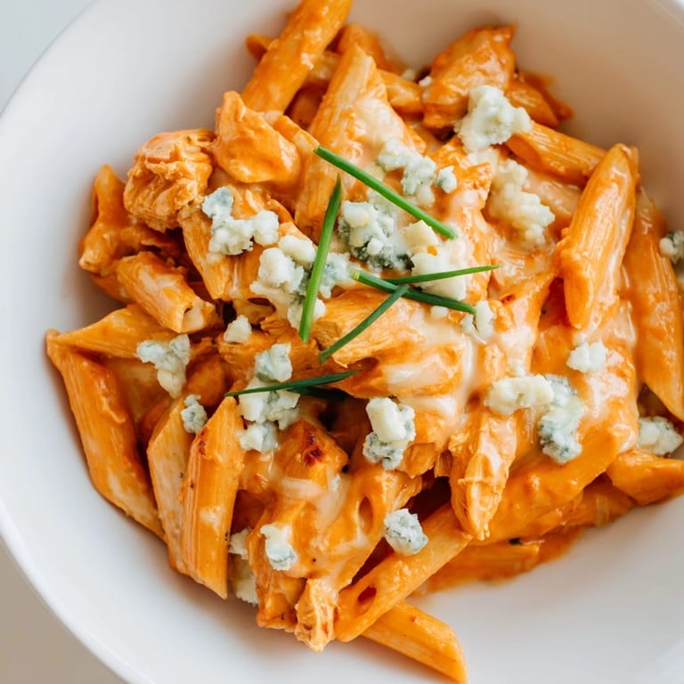 The dish as written contains gluten from traditional pasta. To make it gluten-free, substitute with gluten-free penne or rotini, and verify that your buffalo sauce and cheeses are gluten-free certified.