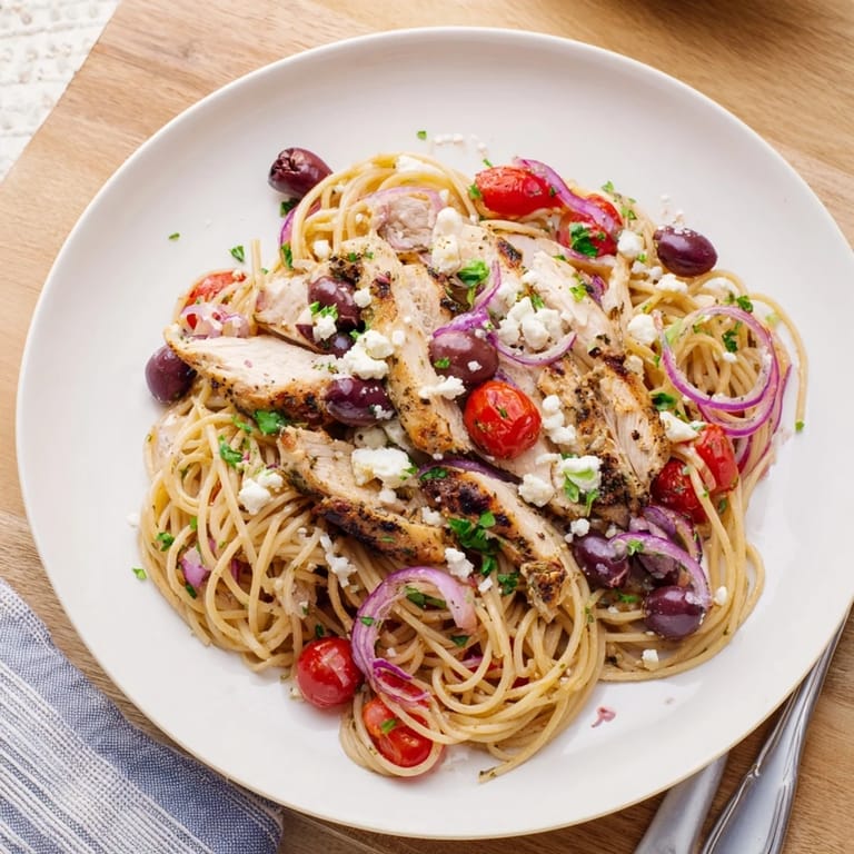Save The scent of oregano and lemon always takes me back to a tiny taverna in Santorini where I watched the owner grill chicken over an open flame while chatting with neighbors. This pasta captures that same sun-drenched spirit, bringing together everything I love about Mediterranean cooking in one bowl. The way the salty feta melts into warm spaghetti while bright tomatoes burst between your fork feels like summer on a plate, no matter the season.